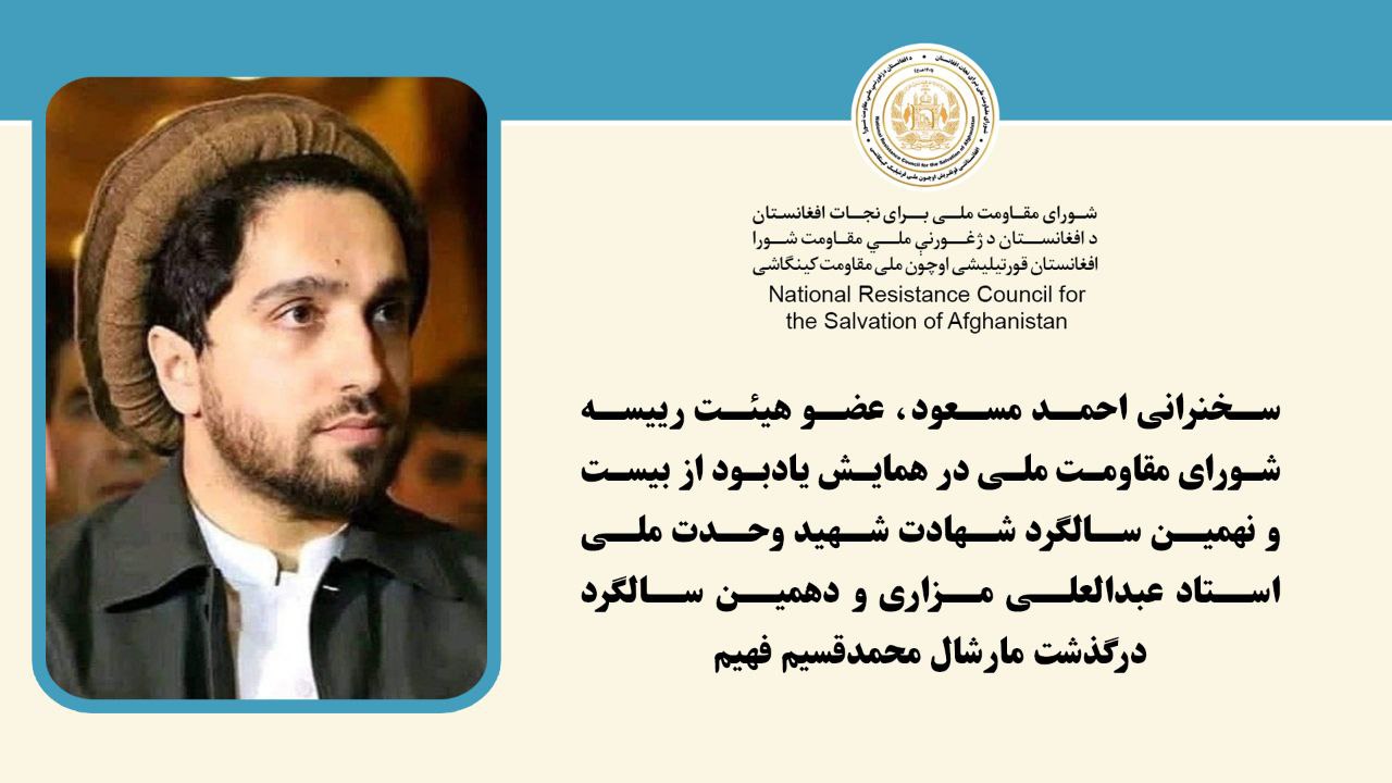 بروز ۲۲ حوت سال ۱۴۰۲ از بیست و نهمین سالگرد شهادت شهید وحدت ملی استاد عبدالعلی مزاری و دهمین سالگرد درگذشت مارشال محمد قسیم فهیم، طی همایشی از سوی شورای مقاومت ملی یادبود بعمل امد.