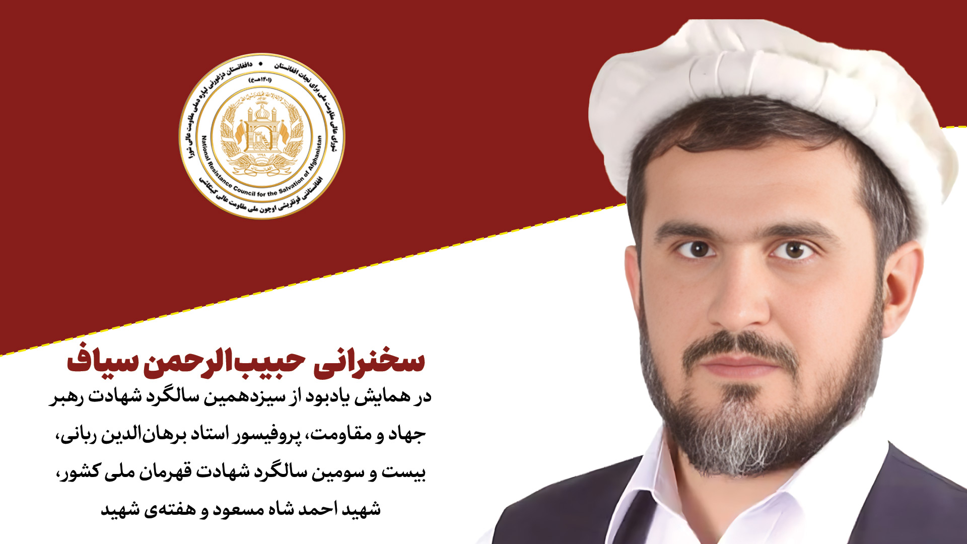 بروز یکشنبه، ۲۵ سنبله سال ۱۴۰۳ هجری خورشیدی، شورای عالی مقاومت ملی برای نجات افغانستان، طی همایش شکوهمندی از بیست و سومین سالگرد شهادت شهید صلح، رهبر جهاد و مقاومت، پروفیسور استاد برهانالدین ربانی، سیزدهمین سالگرد شهادت قهرمان ملی کشور، شهید احمدشاه مسعود و هفتهی شهید، یادبود بعمل آورد. در این مراسم رهبران شورای عالی مقاومت ملی سخنرانی نمودند. در این بخش، سخنرانی جناب حبیبالرحمن سیاف، عضو شورای عالی – شورای عالی مقاومت ملی برای نجات افغانستان را بیننده باشید.