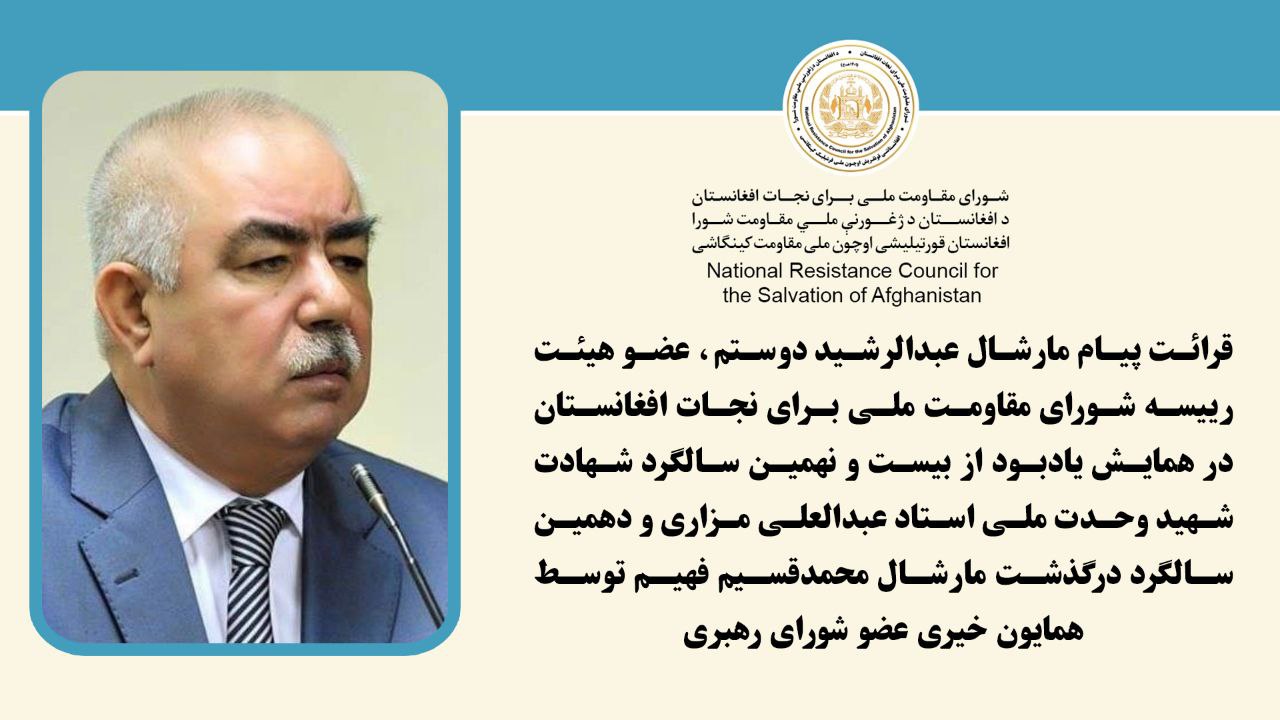 بروز ۲۲ حوت سال ۱۴۰۲ از بیست و نهمین سالگرد شهادت شهید وحدت ملی استاد عبدالعلی مزاری و دهمین سالگرد درگذشت مارشال محمد قسیم فهیم، طی همایشی از سوی شورای مقاومت ملی یادبود بعمل امد.