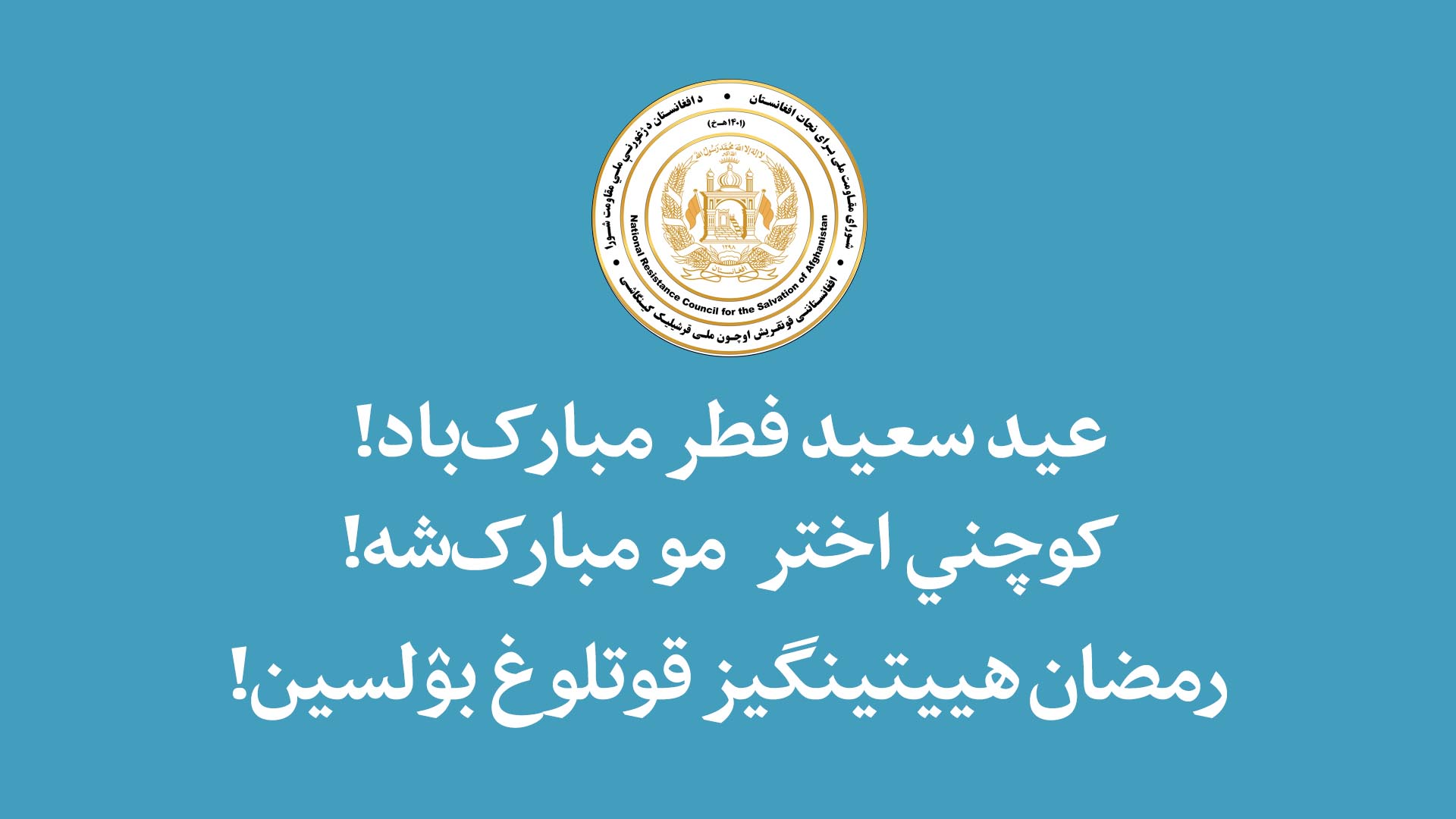 د افغانستان د ژغورنی لپاره دملي مقاومت شورا په داسې حال کې چې یو ځل بیا د نېکمرغه کوچني اختر د رارسېدو په مناسبت د افغانستان قدرمن ولس ته مبارکي وایي، هیله لري چې دا اختر په هېواد کې د روانو کړکېچونو د پای او د ظالمو واکمنانو اخری کال وي. طالبان به ختم شي، ولسواکي به یو ځل بیا حاکمه شي، سوله او ثبات به راشي.